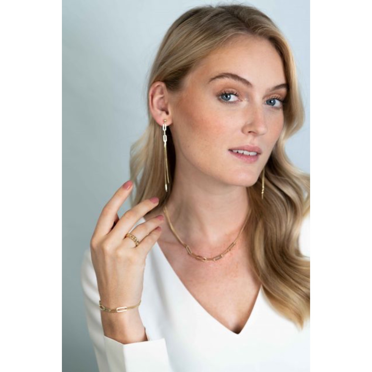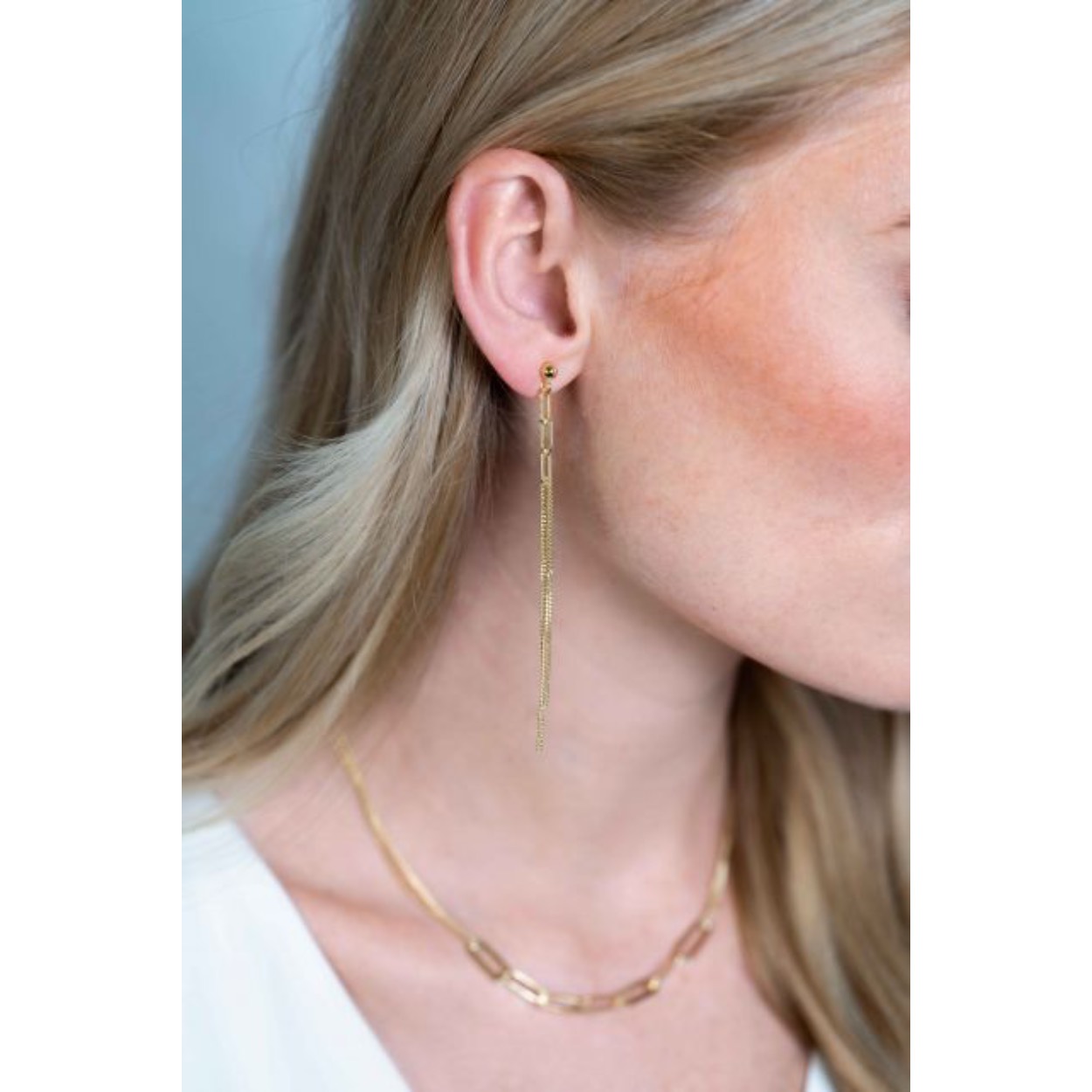 Zilveren oorstekers 14K geelgoudverguld met 3 paperclip hangers en een dubbele ketting van fijne gourmet schakels. Deze lange oorsieraden van 85 mm maken je outfit helemaal af en laten zich uitstekend combineren met het bijpassende collier.
