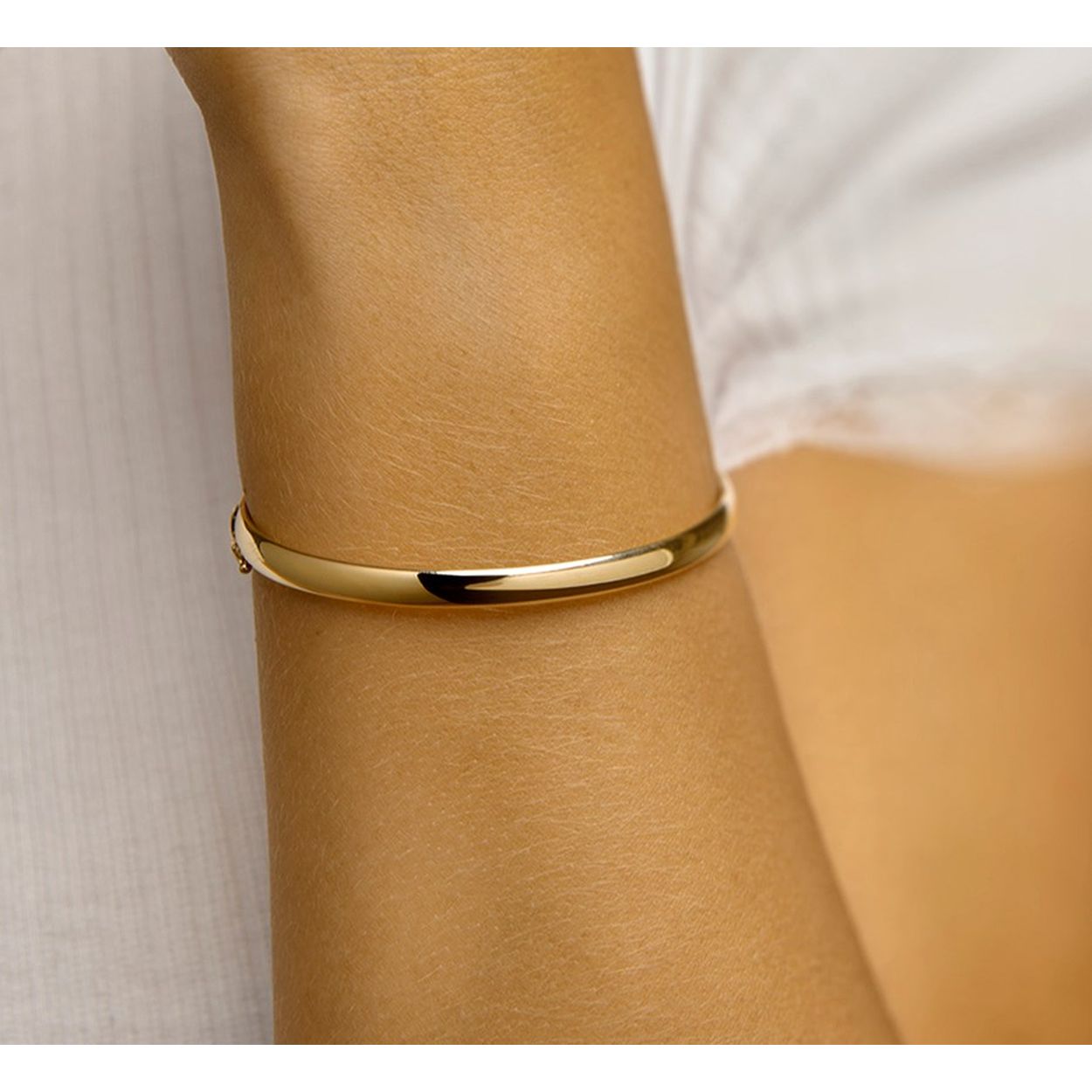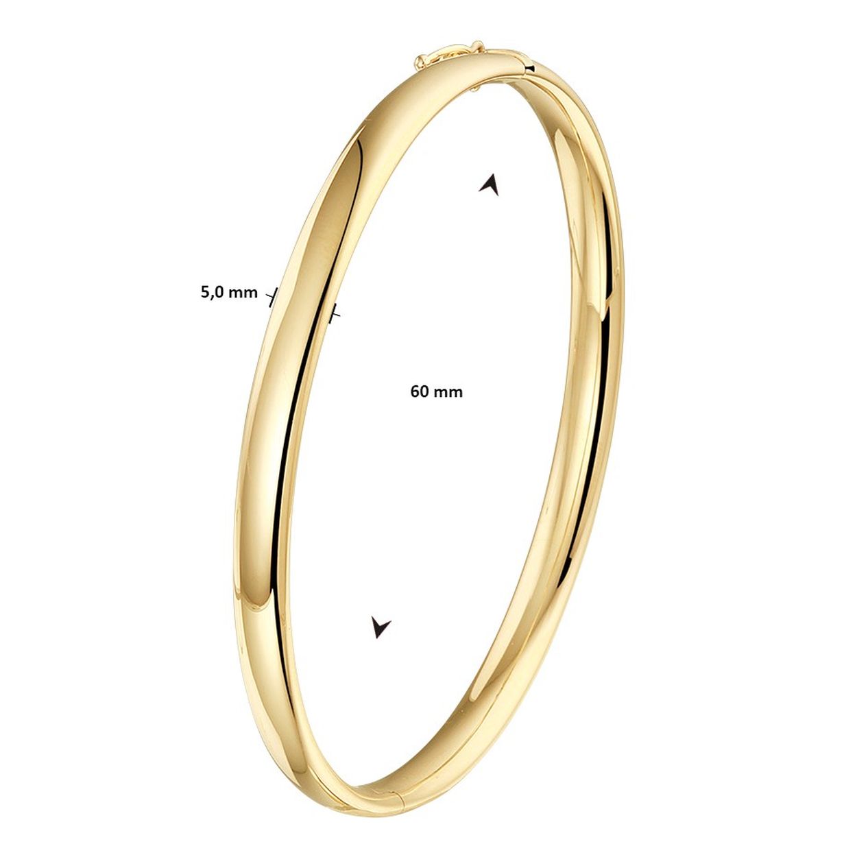 14k Geelgouden bangle uitgevoerd met een scharnier. De bangle heeft een breedte van 5mm en een binnendiameter van 60mm.