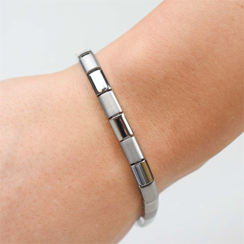 Deze armband valt op door het prachtige deels gematteerd, deels gepolijst titanium. Het titanium heeft een mooie zilveren kleur. De elegante schakelarmband heeft een lengte van 20 cm.