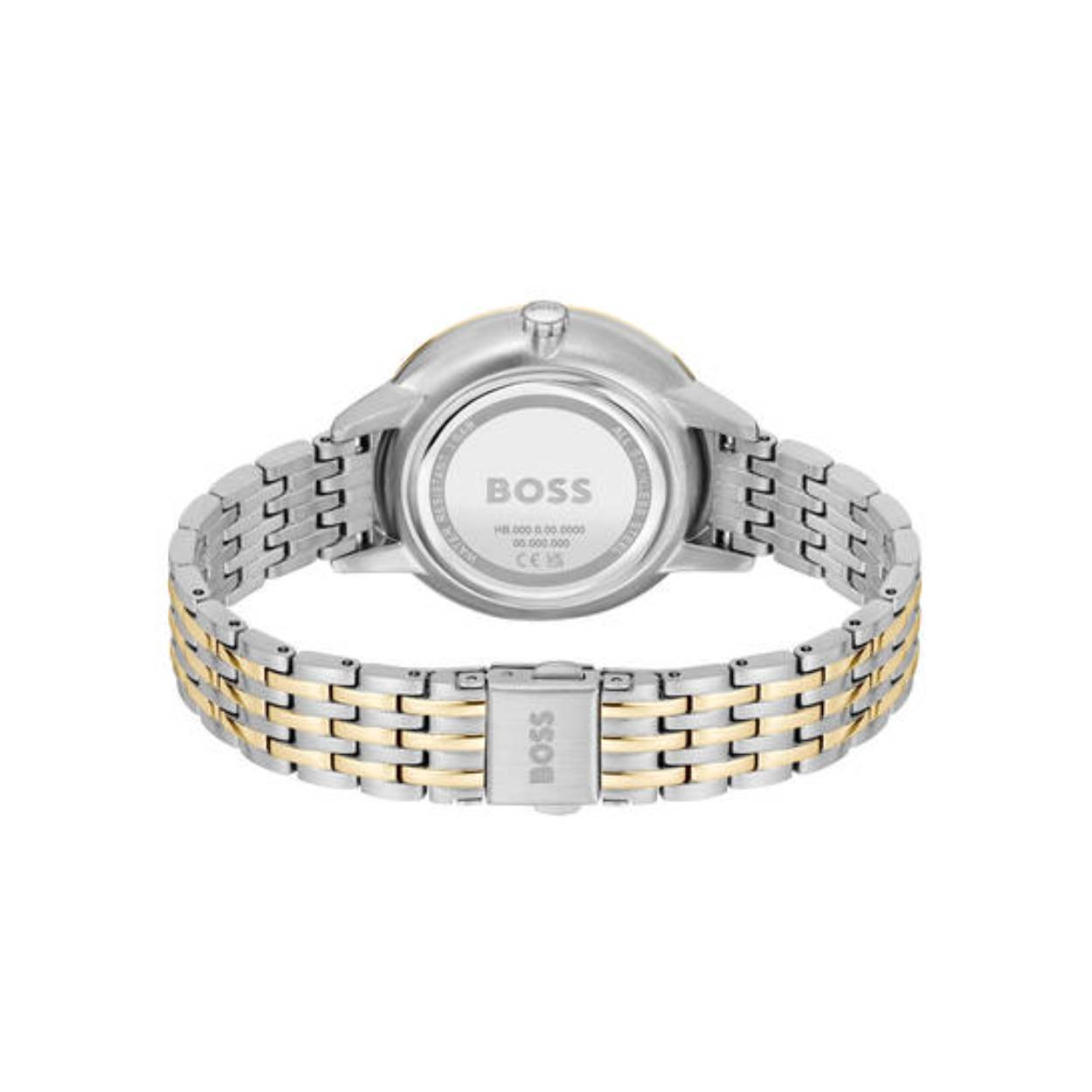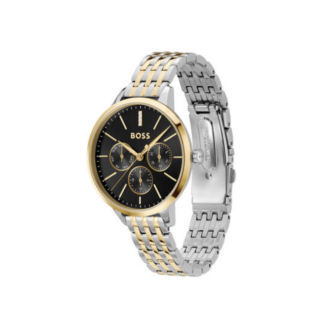Dit BOSS horloge uit de SYMPHONY serie met artikelnr: HB1502783 heeft een elegante uitstraling. Zeer geschikt voor de moderne stijlvolle vrouw van nu. Het dameshorloge valt op door zijn stalen horlogekast met een gladde goudkleurige bezel en een zwarte sunray wijzerplaat met een dag, datum en 24-uursaanduiding. Opvallend zijn de fijne wijzers, 4 kristallen op de 12 en het strakke BOSS logo. Aan de kast zit een mat glanzende zeer fijne bicolor stalen schakelband zit met een vouwsluiting. Het horloge heeft een doorsnee van 38mm met een mineraalglas en is 3ATM.