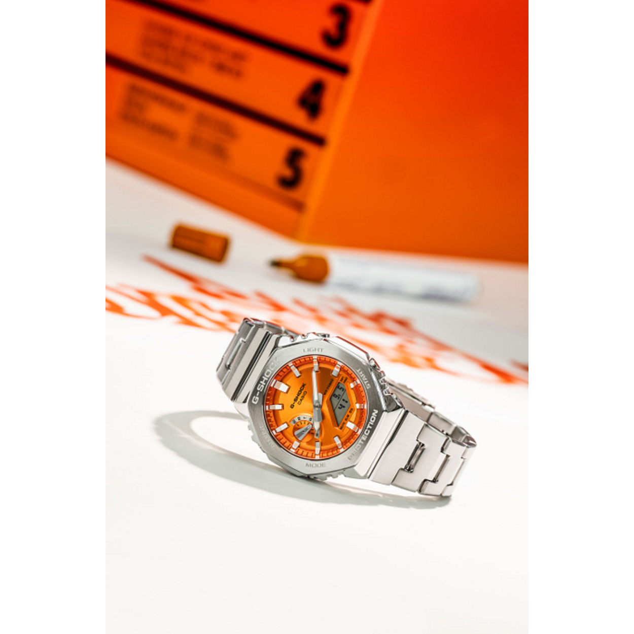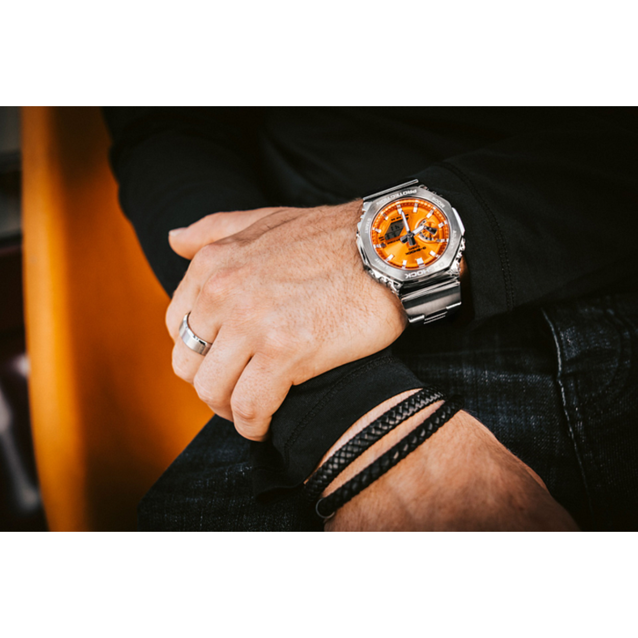 De zilverkleurige band van roestvrij staal is niet alleen stevig, maar ook comfortabel om te dragen. De vlinder- of vouwsluiting zorgt ervoor dat het horloge goed om je pols blijft zitten. Daarnaast beschikt de CASIO G-SHOCK GM-2110D-4AER over een handige datumweergave, zodat je altijd op de hoogte bent van de juiste datum.