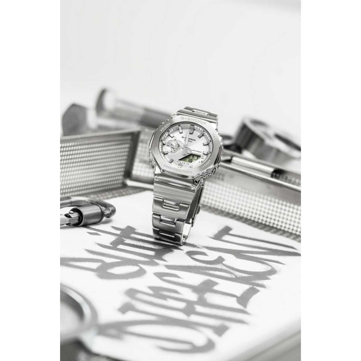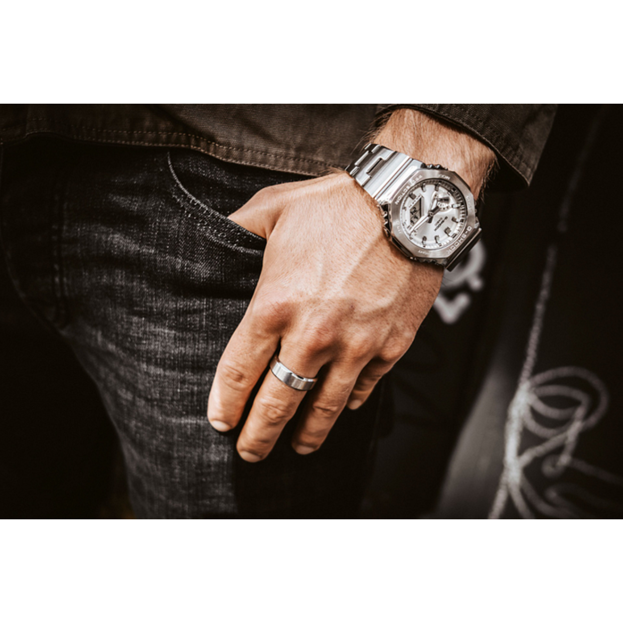 De band van de CASIO G-SHOCK GM-2110D-7AER is zilverkleurig en gemaakt van roestvrij staal, wat zorgt voor een comfortabele en stevige pasvorm om je pols. Daarnaast beschikt dit horloge over een handige datumweergave en is waterdicht tot 20 bar, wat het geschikt maakt voor duiken en andere watersportactiviteiten.
