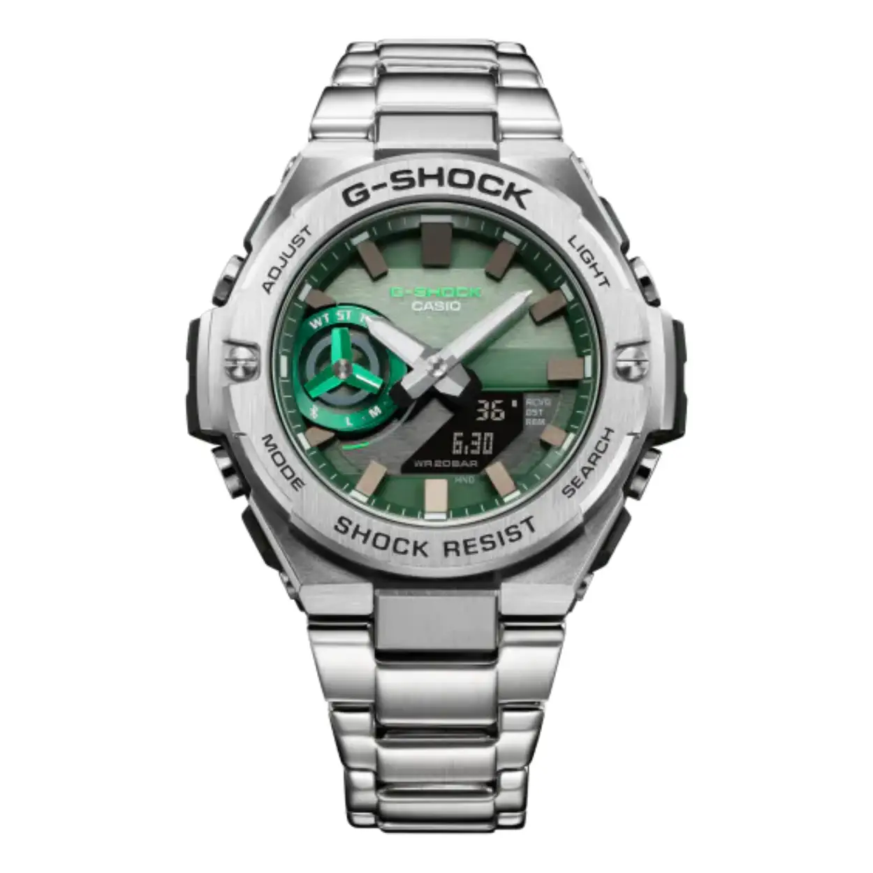 Zowel het digitale als analoge gebied van het horloge wordt verlicht als de EL-verlichting wordt ingeschakeld.