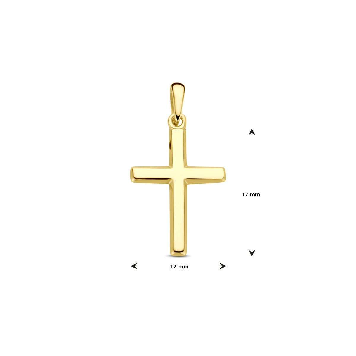 14k Geelgouden hanger uitgevoerd in de vorm van een kruis. De hanger heeft een totale hoogte van 23mm. Het kruis heeft een afmeting van 17x12mm.