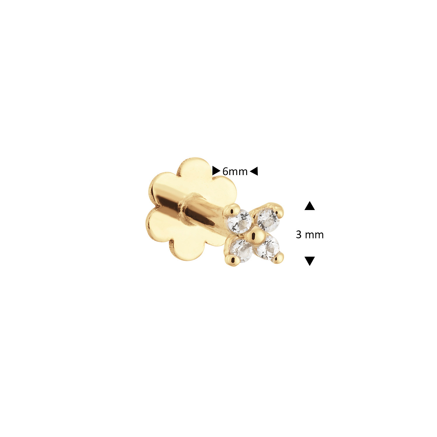 De 14 karaat gouden Bloom White Topaz piercing met 2 schroefstaafjes en een bloemetje als achterkant, maken het in- en uitdoen heel makkelijk! Je kunt ze ook inhouden als je gaat slapen. Voeg als finishing touch een piercing toe aan je Jackie earparty!