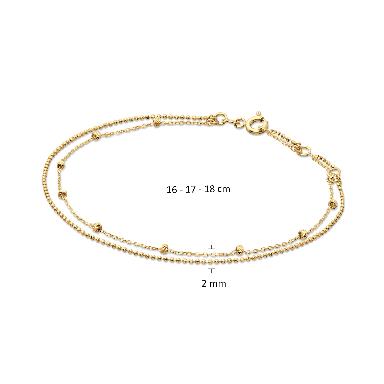 Twee-in-één met deze 14 karaat gouden armband. Deze fijne armband bestaat uit twee banden, 1 band met fijne bolletjes en 1 band met grovere bolletjes. De banden komen samen bij de sluiting. Venetian Diary Als je aan een betoverende stad denkt, waar je kunt verdwalen in smalle straatjes en waar gondels je meenemen langs de mooiste gebouwen en architectuur. Waar op iedere hoek iemand spontaan in een serenade kan uitbarsten. Aan welke stad denk je dan? Juist, het Italiaanse Venetië. Mysterieus, betoverend en romantisch. Een stad met elegante grachten, prachtige pleinen en kleurrijke mensen. Een stad waar ik mijn hart aan heb verloren. Het merk Jackie is hét 14 karaat gouden on trend sieradenmerk. De collecties zijn geïnspireerd op de reizen die ik maak, van stedentrips tot exotische oorden. Elk gouden sieraad is helemaal van nu, handgemaakt door Europese goudsmeden en vervaardigd van overwegend gerecycled goud met echte edelstenen en zoetwaterparels. Elke collectie is dan ook met veel liefde en passie samengesteld. Mijn Jackie sieraden zijn de perfecte finishing touch voor iedere outfit! Specificaties - Armband - Materiaal: 14 Karaat - Geelgoud - 585 - Bubbel Strengs - Totale lengte: 18cm