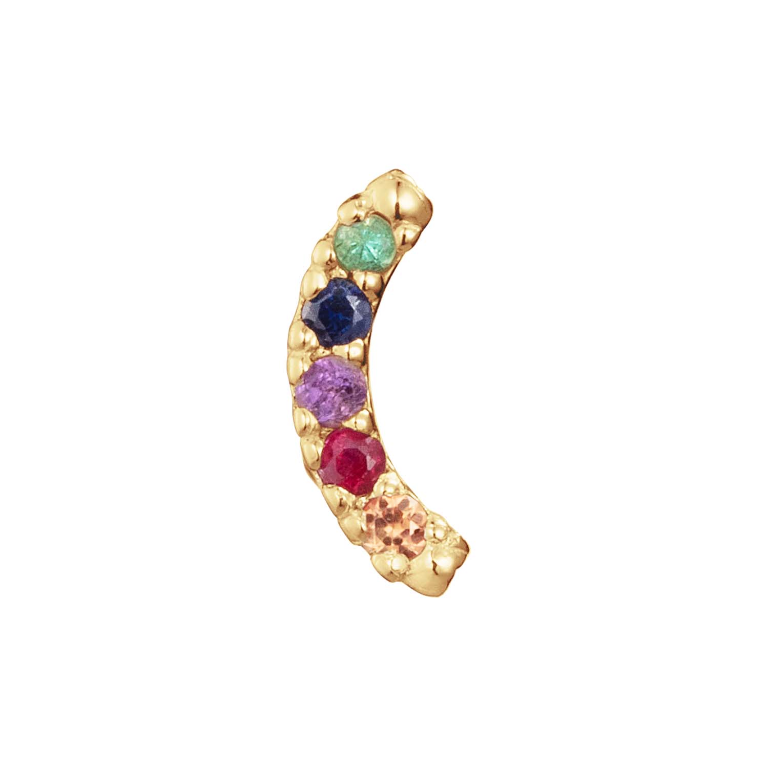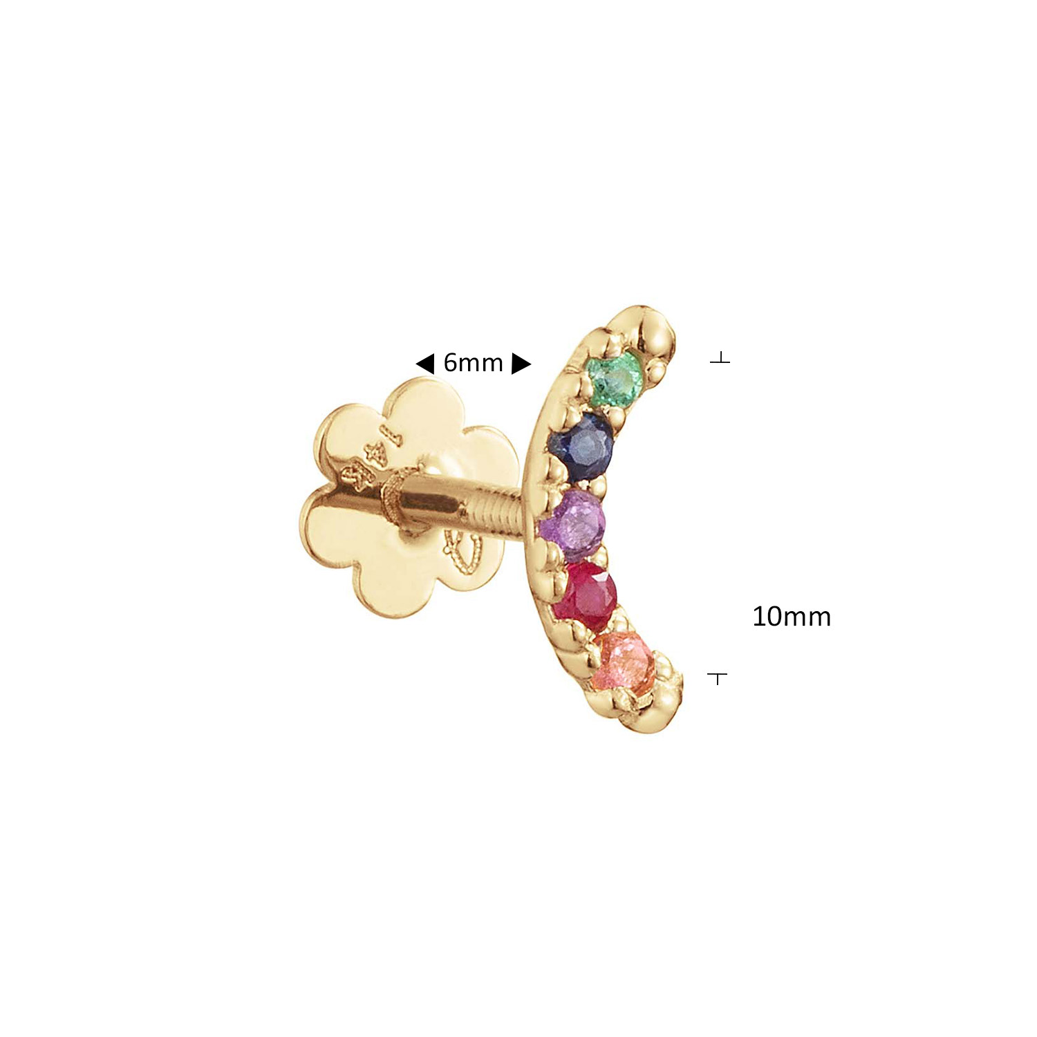 Deze 14 karaat piercing mag zeker niet ontbreken bij jouw earparty! De piercing is voorzien van 5 edelstenen in de kleuren van de regenboog én heeft een bloemetje als achterkant.