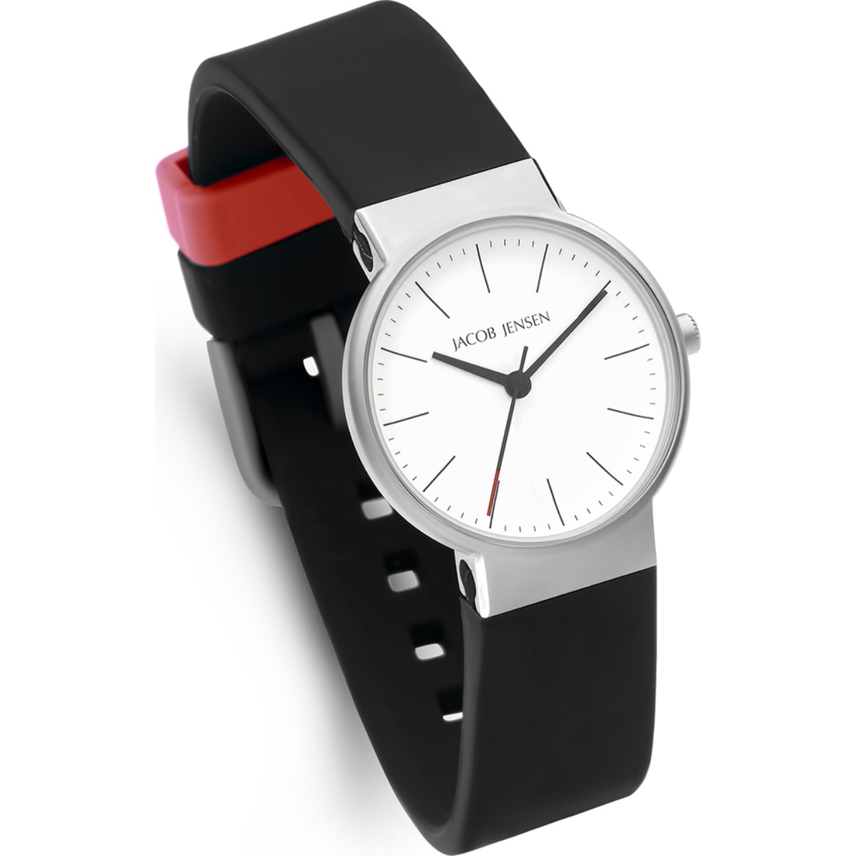 Dit Jacob Jensen horloge heeft een titanium kast met een diameter van 29mm en is voorzien van een rubberen band. In de kast bevindt zich een kwaliteitsuurwerk en is afgewerkt met saffierglas.
