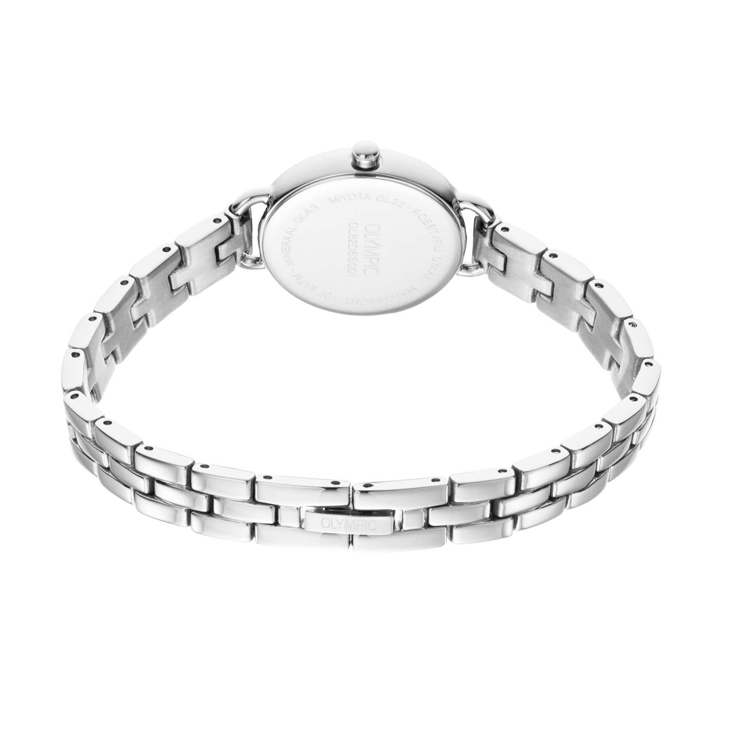 Dit unieke Olympic horloge met artikelnummer: OL82DSS001 is een dameshorloge met een chique uitstraling. Het horloge heeft een ronde stalen kast met een zilverkleurige sunray wijzerplaat met fijne streepjes. Aan de kast zit een fijne stalen schakelband met druksluiting. Het horloge heeft een mineraalglas, een doorsnee van 26mm en is 3ATM.