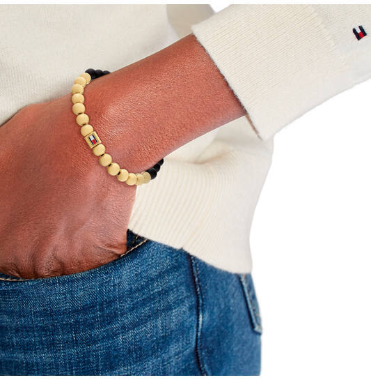 Deze armband van Tommy Hilfiger uit de jewelry serie Semi-Precious met nr: TJ2780961 is een fijn model. De dames armband is in 2 helften verdeeld met kralen. Een helft heeft goudkleurige kralen en de andere helft is Onix. In het midden zit een stalen tonnetje met daarop het Tommy logo. De kralen zijn geregen op elastiek en past om een pols van ong 16,5cm. Ook leuk te combineren met de bijpassende oorbellen en andere sieraden van Tommy Hilfiger.