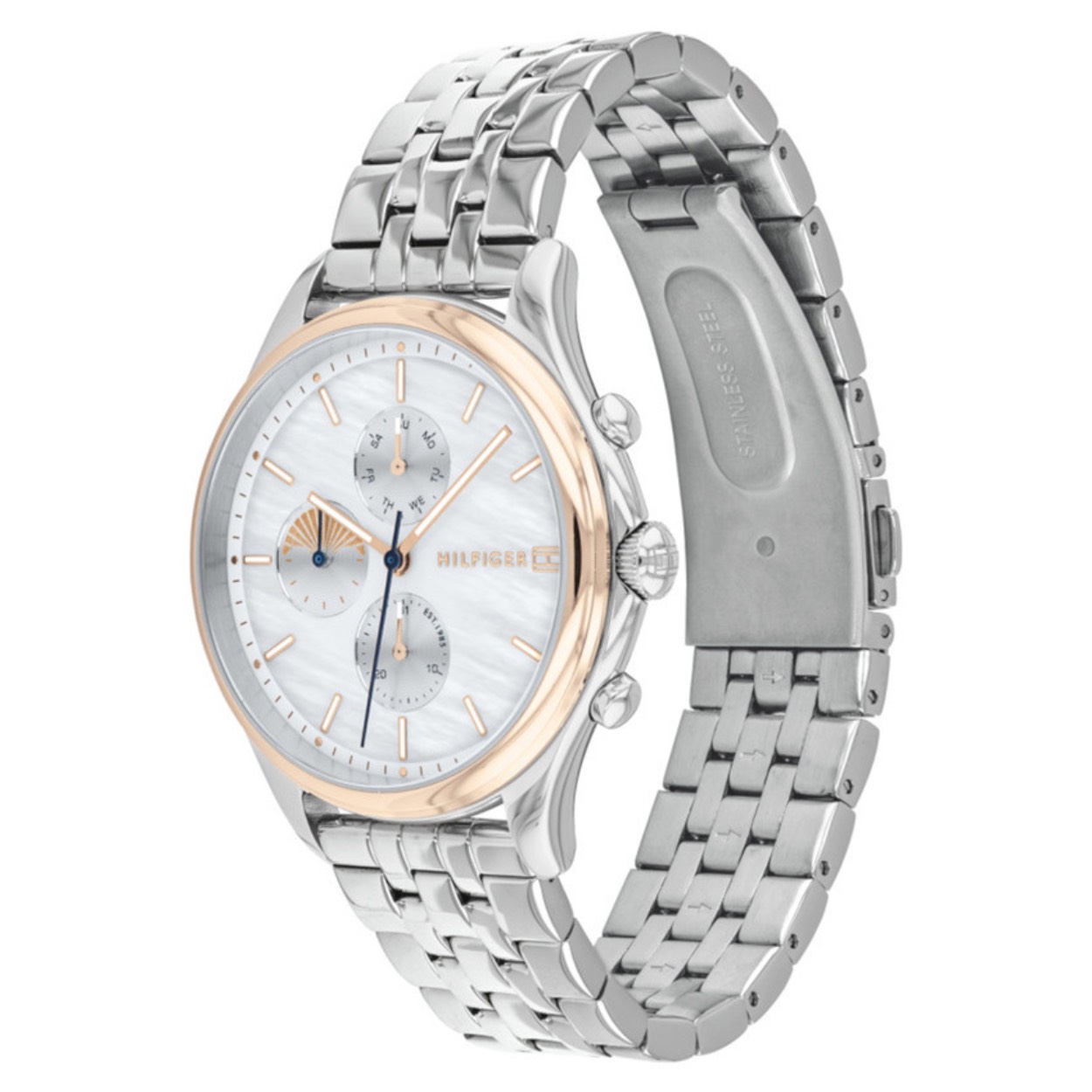 Dit luxe dames horloge is van Tommy Hilfiger. Het horloge is voorzien van een stalen band en een parelmoer wijzerplaat. Het horloge is een multifunctie en de diameter van de horlogekast is 38 mm.
