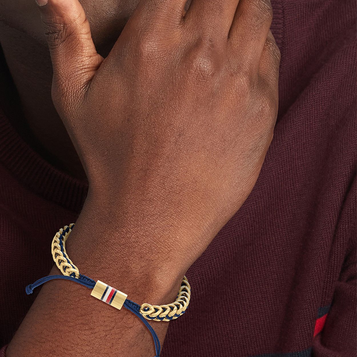 Deze armband van Tommy Hilfiger uit de jewelry serie met nr: TJ2790512 is een apart model. De herenarmband heeft blauwe nylon draad waarover een gevlochten goudkleurige stalen laag is gemaakt. De sluiting is een nylon knoop die verstelbaar is en wordt omsloten door een goudkleurig stalen tonnetje met daarop het tommy logo. De armband is op lengte verstelbaar tot 19,5cm. Ook leuk te combineren met andere armbanden van Tommy Hilfiger.