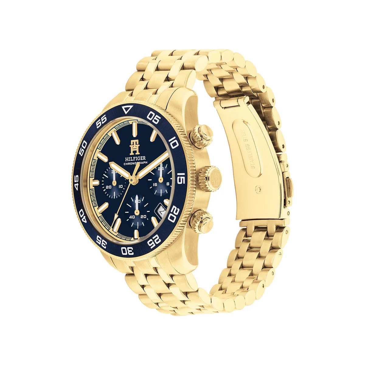 Dit specifieke horloge van Tommy Hilfiger uit de TH85 serie met artikelnr: TH1792158 is een sportief herenhorloge die niet in je collectie mag ontbreken. Het stalen herenhorloge heeft een ronde goudkleurige kast met een donkerblauwe bezel met daarop een GMT-tijdwijzer.  Het horloge heeft een donkerblauwe wijzerplaat met goud/zilverkleurige wijzers als uursaanduiding en een datum. De goudkleurige schakelband is op lengte verstelbaar en heeft een vouwsluiting. Het horloge heeft een mineraalglas, een doorsnee van 41mm en is 5ATM.